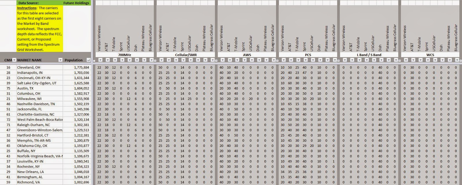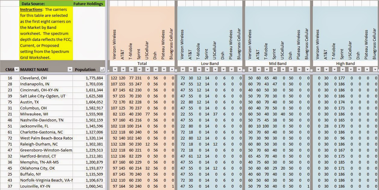 The November 2014 Spectrum Ownership Analysis Tool includes several enhancements to the Market Level Reports. Market Level Reports are available for Cellular Market Areas (CMA) and Economic Areas (EA). Initially these market level reports only included spectrum depth values for each carrier by spectrum band. With this update, you can see each selected carrier's total spectrum holdings, their spectrum holdings in each of the primary band classes (Low Band, Mid Band, and High Band), and their spectrum holdings in each spectrum band.