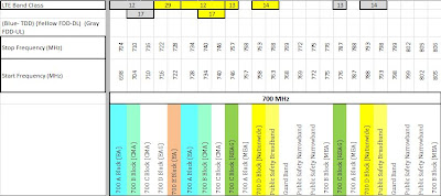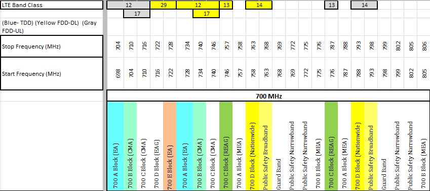 In the images below, the band classes are color coded Gray for Uplink Spectrum, Yellow for Downlink Spectrum, and Blue for Spectrum supporting Time Division Duplex.