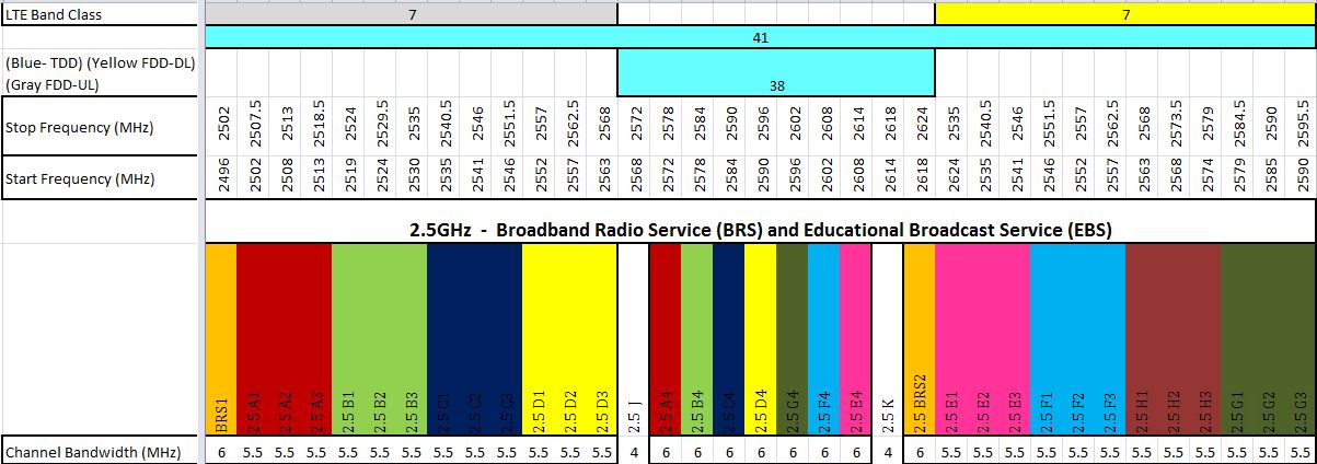 From the image above, the BRS spectrum sale would include the Orange (BRS1/BRS2) channels, the Pink (E channels), Light Blue (F channels) and Brown (H channels). This would equate to one contiguous block of 55.5MHz of spectrum, a 12MHz block of spectrum (E4,F4), and the isolated BRS1 channel. The 12MHz block could only be used if mid-band video operations have ceased in a market. Currently, I don't believe that any of the Top 10 markets have completed ceased video operations. The 55MHz of spectrum can support 2 - 20MHz TDD-LTE channels. This would virtually eliminate the ability to utilize the EBS/BRS spectrum for any FDD-LTE operations. It may be possible with a guardband in the H channels to operate the D channels and G channels in a FDD-LTE configuration.
