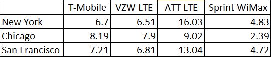 Above is a restatement of the testing data from PC Magazine which T-Mobile released. It is interesting to note how far their speeds have fallen from their early announcements in late 2010 concerning the HSPA+ network. It is also worth noting that they compared AT&T's LTE network. You can again see the loading effect on the network. AT&T's Chicago network was launched September 2011 so it has been loading for over a year reflecting the slower speeds. AT&T's complete New York and San Francisco networks are much newer, launching September 2012, thus carrying less traffic. I am curious why T-Mobile did not chose to compare themselves to AT&T's 4G (HSPA+) network.