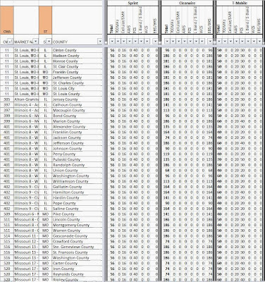 Company By Band worksheet from the AllNet Labs' Spectrum Ownership Analysis Tool. Looking first at Verizon, we can see the variety of spectrum depths across the EA that Verizon indicated in their FCC filing. Verizon will range from 62 MHz to 117 MHz depending on the county. The only county that Verizon controls 117 MHz is Montgomery County, MO which is 40 miles west of St. Louis.